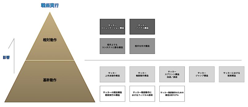 指導者向けのオンライン学習コースであるサッカー戦術動作アプローチでは、動きの構造のうち戦術を実行するために必要となる動きのことを『戦術動作』と名づけ、戦術動作を軸としてサッカー指導者の方々に動きの構造を体系立てて学んでいただける形を構築しました。